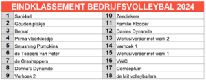 Er hadden zich 18 teams aangemeld voor het bedrijfsvolleybaltoernooi. Er werd op 2 avonden gespeeld in d’Overtoom. Na de wedstrijden in de 3 poules werden de nummers 1 en 2 van elke poule in een finale poule ingedeeld. Zij streden om plek 1 tm 6. De overige teams werden verdeeld over 3 poules en speelden om plek 7 tm 18.